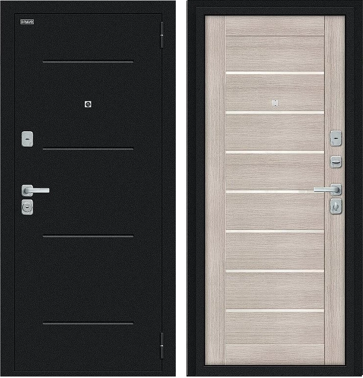 Надежная входная Дверь Браво Техно/BChrome Букле черное/Cappuccino Melinga премиум класса по цене 34 567 руб. Большая толщина стали защитит от проникновения в ваш дом, квартиру или коттедж. Используется очень качественная фурнитура: замки, цилиндры, ручки, защелки. Покрытие и отделка двери изготовлено под внимательным контролем производителя. Дверь имеет долгий срок службы и гарантию.