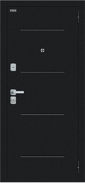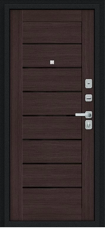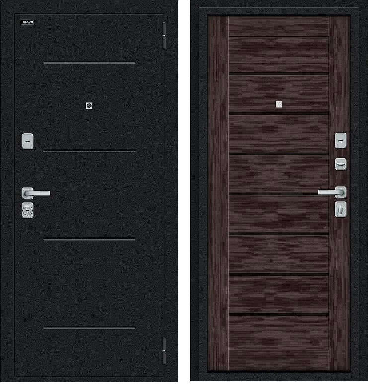 Надежная входная Дверь Браво Техно/BChrome Букле черное/Wenge Melinga премиум класса по цене 34 567 руб. Большая толщина стали защитит от проникновения в ваш дом, квартиру или коттедж. Используется очень качественная фурнитура: замки, цилиндры, ручки, защелки. Покрытие и отделка двери изготовлено под внимательным контролем производителя. Дверь имеет долгий срок службы и гарантию.
